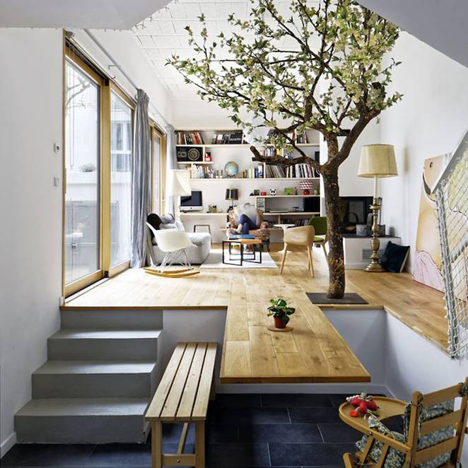 We’re admittedly fond of interior spaces that attempt to bring in a bit of nature inside. While it may be a bit clichéd, the tree planted inside is one of the most oft used natural elements of this kind. This modern apartment in Paris’ twentieth arrondissment has what looks like a faux-tree, but it does have a striking design where the living room floor becomes the kitchen’s cantilevered dining table.