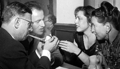 Boris and Michèle Vian were the natural touts of these places. Their friendship, presence and support made the owner of a network even more secure than a gang. The case of the Lorientais , rue des Carmes, young and inexpensive, which owed its reputation to the quality of its music from 1946 to 1948 (the orchestra of Claude Luter who then emigrated to Kentucky ) but also of the Club Saint-Germain , rue Saint-Benoit, and the Vieux Colombier which could be proud of the association of clarinetist Claude Luter and saxophonist Sydney Bechet, not to mention La Rose rouge, rue de la Harpe then rue de Rennes. The point is that jazz and existentialism were the two pillars of the myth. As for the first, its aura would have been even more important if it had not been undermined by a quarrel between the Ancients and the Moderns, the former being led by Hugues Panassié, and the latter by Charles Delaunay, the musicians being the main ones. victims of this jazz war. Without forgetting another quarrel, more discreet, more hidden but no less lively, which opposed French jazzolaters who, on principle and by taste, swore only by black musicians, to those who reproached them for this form of reverse racism, of snobbery. and in bad faith ( Jazz Hot magazine )