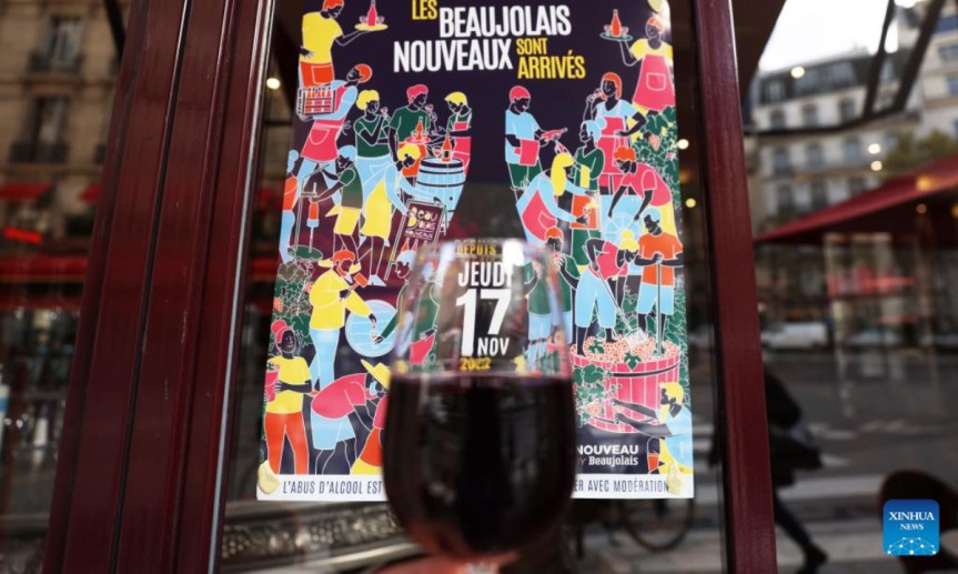 A glass of Beaujolais Nouveau wine is seen at a restaurant in Paris, France, Nov 17, 2022. The new Beaujolais Nouveau, a well-known French wine, was released on Thursday.