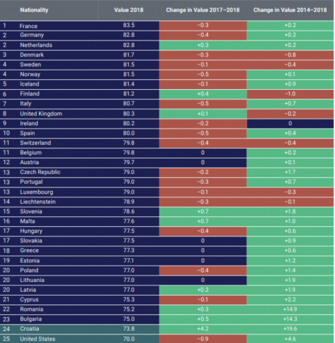 At the bottom of the top 25 were the United States (70.0), with Croatia (73.8), Bulgaria (75.0), Romania (75.2), Cyprus (75.3), Poland, Latvia and Lithuania (all 77.0) coming just ahead.